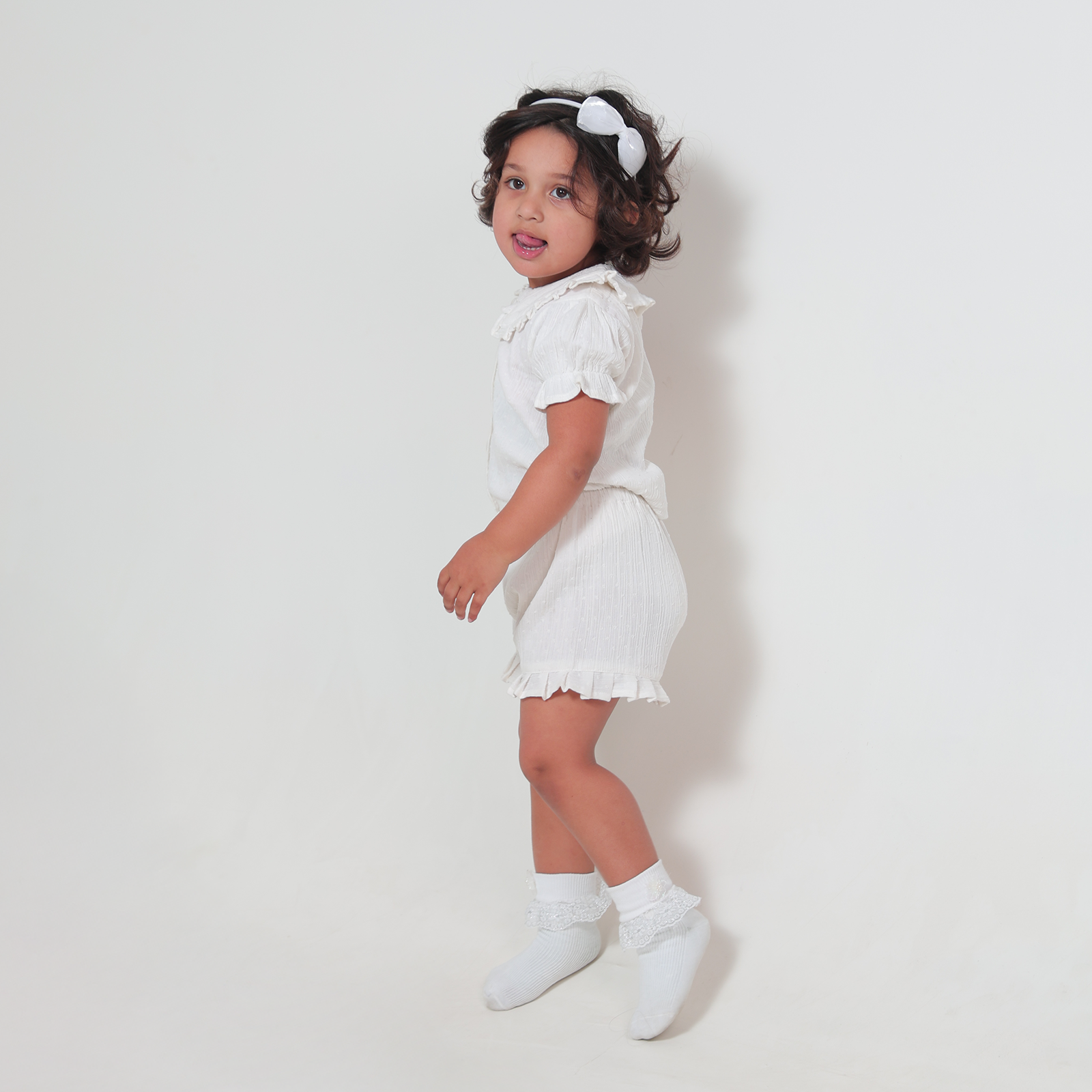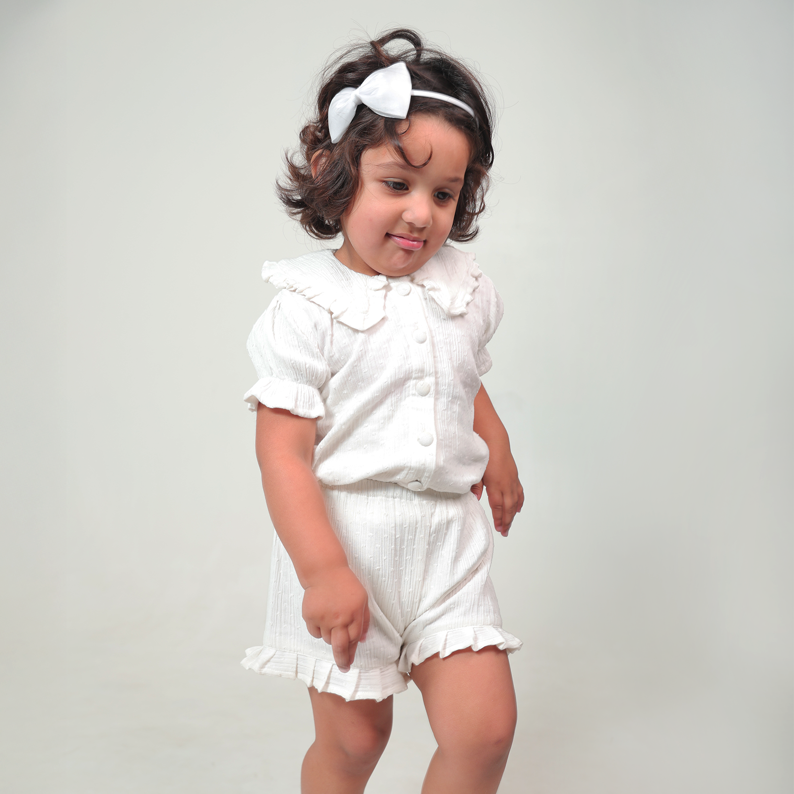 The Lil’ Ruffle Daydream Set is where sweetness meets sophistication.;This charming co-ord set includes a delicately textured top with ruffled collar and puffed sleeves, paired with matching frill-hem shorts — making it perfect for both playdates and picture-perfect moments.Thoughtfully designed to keep your little one cool, comfy, and endlessly cute, this all-white ensemble brings elegance to everyday wear while allowing full freedom to move, laugh, and twirl.